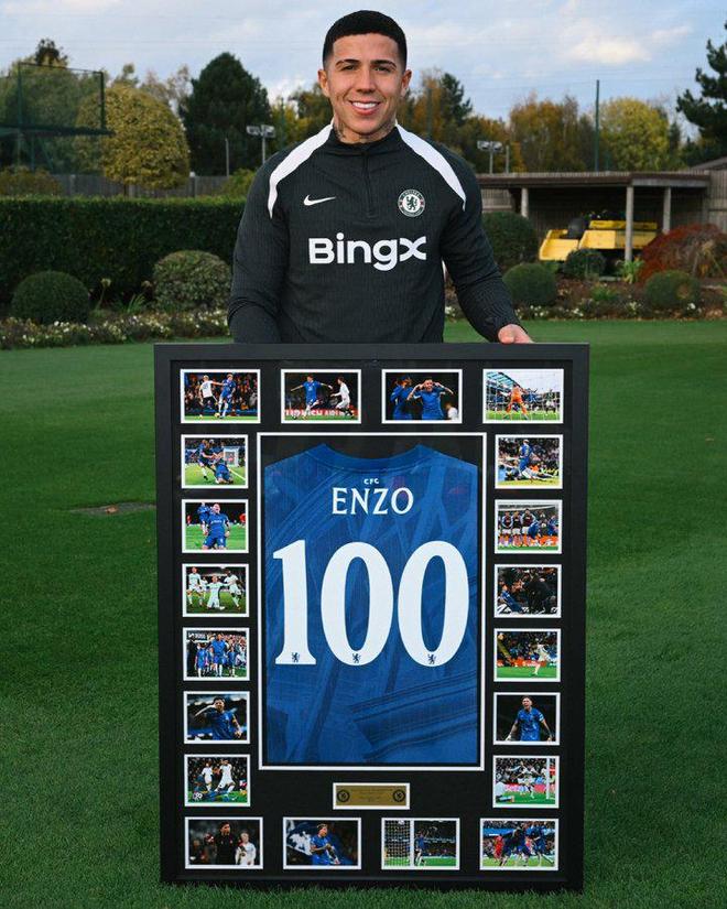 雷速體育10月29日訊 據阿根廷媒體《奧萊報》報道,阿根廷國腳恩佐日前接受了切爾西俱樂(lè )部授予的百場(chǎng)里程碑紀念球衣。